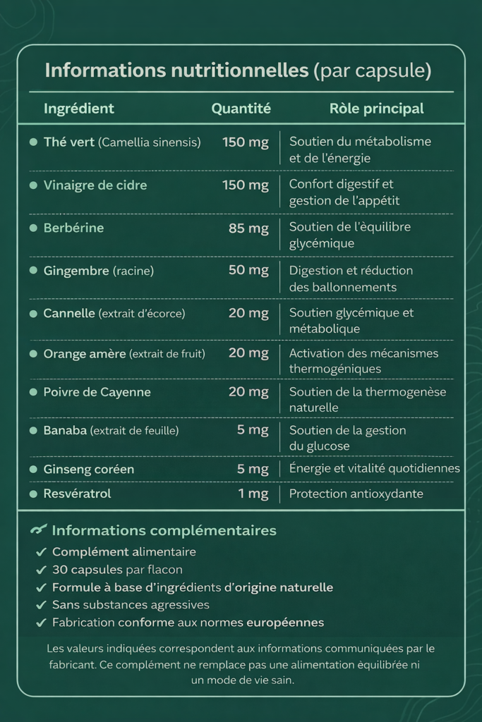 Notre équipe a analysé Vorisol de manière objective. Nous avons examiné sa composition (notamment le thé vert, le ginseng, la berbérine, le vinaigre de cidre et la cannelle) et étudié les avis d’utilisateurs, afin de mieux comprendre son fonctionnement, son utilisation et les conditions de livraison et de garantie proposées.